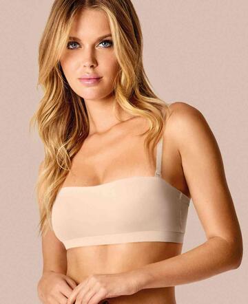Top a fascia con imbottitura estraibile senza ferretto in microfibra reciclata effetto setoso, spalline sfilabili.SENZA APERTURA POSTERIORETaglie: 2-3-4 Coppa B