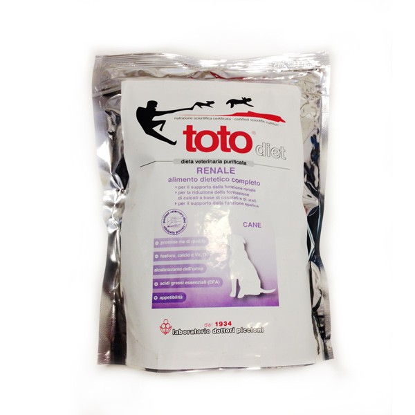 Toto Diet Renale è un alimento dietetico completo per cani indicato come supporto della funzione renale in caso di insufficienza renale cronica o temporanea, con bassa concentrazione di fosforo, ridotto tenore di proteine ed una elevata qualità per la riduzione della formazione di calcoli a base di ossalati, con bassa concentrazione di calcio e vitamina D3 e proprietà alcalinizzanti dell’urina.