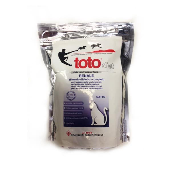 Toto Diet Renale è un alimento dietetico completo per gatti indicato come supporto della funzione renale in caso di insufficienza renale cronica o temporanea, con bassa concentrazione di fosforo, ridotto tenore di proteine ed una elevata qualità per la riduzione della formazione di calcoli a base di ossalati, con bassa concentrazione di calcio e vitamina D3 e proprietà alcalinizzanti dell’urina.