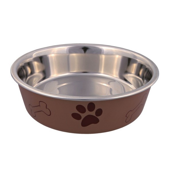 Ciotola in acciaio inox con supporto in plastica ed anello in gomma antiscivolo. Disponibile in colori assortiti.