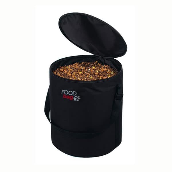 Porta Crocchette nero in nylon resistente per conservare il cibo secco di cani e gatti. Protegge dall’umidità, con tracolla regolabile per trasportarlo o appenderlo e anello in metallo sulla base per una maggior stabilità.