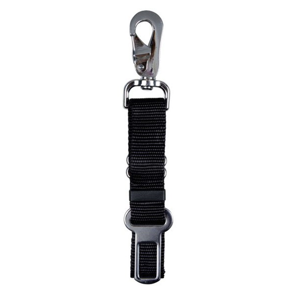 Manigliotto universale per cinture di sicurezza per i comuni attacchi di cinture delle automobili (escluso Ford e Volvo). Con moschettone e fettuccia nera.