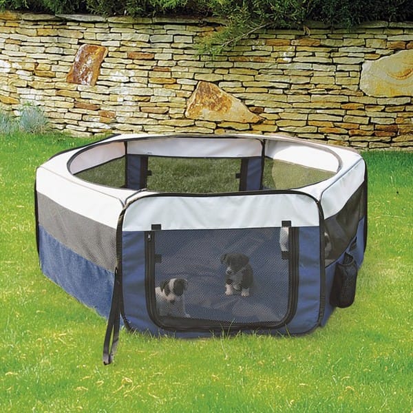 Recinto per cuccioli in Nylon resistente, ideale per uso esterno. Con fondo removibile per permettere il contatto diretto con il tappeto erboso. Il rivestimento in gomma ed il bordo rinforzato impediscono che il fondo si sporchi e proteggono dall’umidità del suolo. Con due tasche laterali. Può essere fissato al suolo, la rete staccabile impedisce che l’animale salti fuori e lo protegge da gatti o uccelli rapaci. Pieghevole e salva spazio con borsa in nylon per il trasporto.