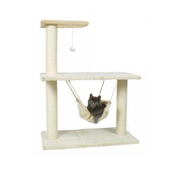 Tiragraffi con fodera in peluche, tronchetti rivestiti in sisal naturale e gioco appeso ad un elastico.