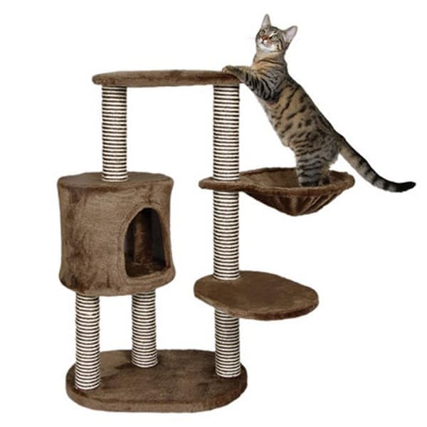Tiragraffi con fodera in peluche, piattaforma imbottita e tronchetti rivestiti in sisal naturale.