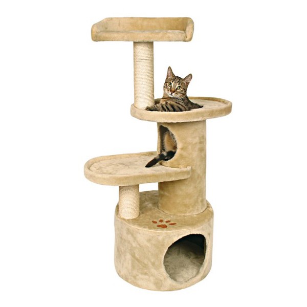 Tiragraffi con fodera in peluche e piattaforma imbottita, tronchetti rivestiti in sisal naturale e nicchia completamente rivestita in pile.