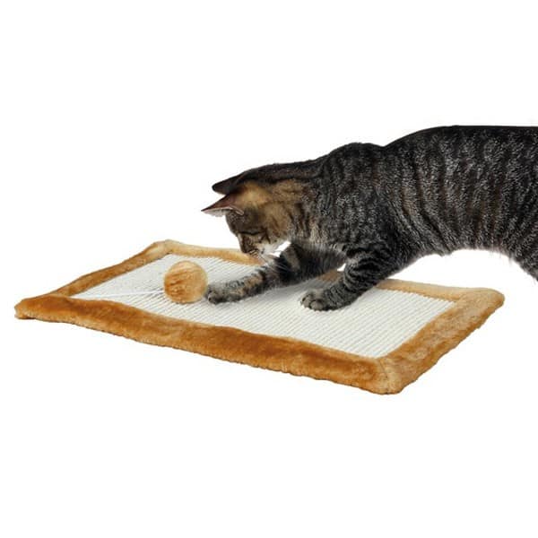 Tiragraffi a tappeto per gatti adulti e cuccioli, con fodera in peluche beige e superficie in sisal. Con parte posteriore in EVA e gioco-pallina appeso ad una corda. Ideale sia da appendere che da appoggiare a terra.