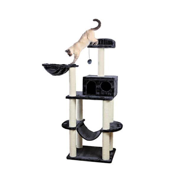Tiragraffi sviluppato su 4 piani con piattaforma imbottita e tronchetti in sisal naturale. Le fodere dei piani e la nicchia sono rivestiti in peluches, con gioco appeso ad un elastico.