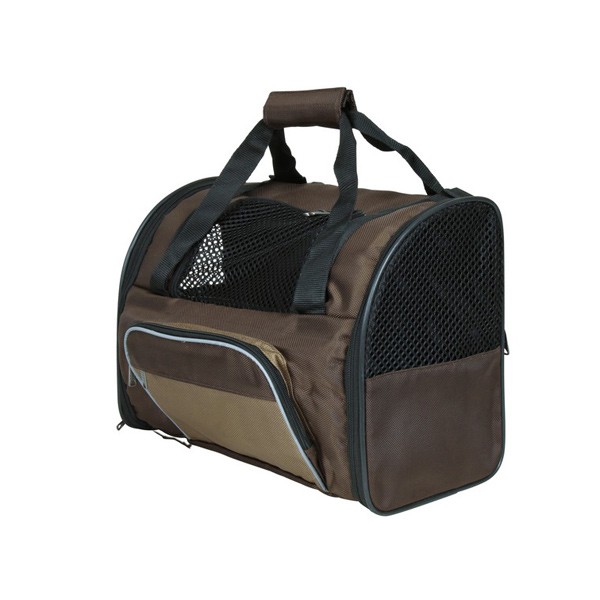 Zaino molto imbottito per il trasporto del cane in nylon, con apertura frontale e laterale e bretelle regolabili nelle spalle e girovita, più tasca per il cellulare. Bordo riflettente, guinzaglio corto per evitare che il cane salti fuori, inserti in rete per aerazione. Possibilità di fissarla ad un trolley.