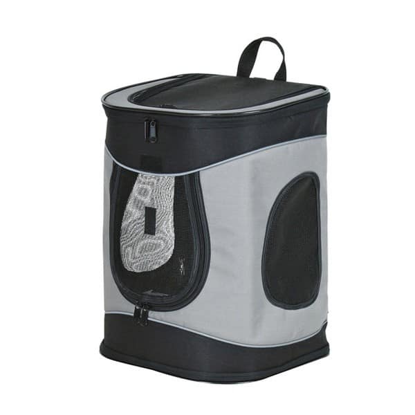 Zaino per il trasporto del cane in nylon, ideale per lunghe camminate, per fare jogging e trekking, con apertura frontale superiore. Forma anatomica confortevole per la schiena e bretelle con chiusura in vita per distribuire il peso, con bordi riflettenti e guinzaglio corto interno per impedire che il cane salti fuori.
