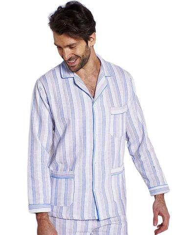 Pigiama uomo con giacca aperta e collo camicia in TESSUTO DI FLANELLA con motivo a righe, due tasche e taschino, pantalone con apertura 2 bottoni ed elastico in vita.COLORE DELLE FOTO AZZURROTaglie_48=M50=L52=XL54=XXL56=XXXL58=XXXXL60=XXXXXL